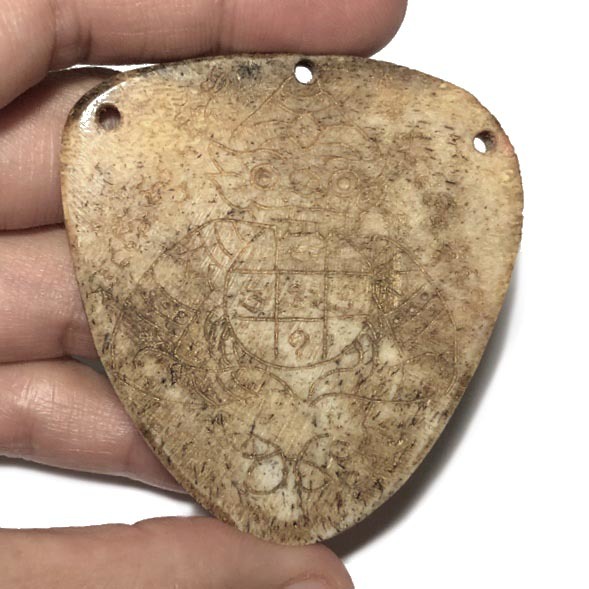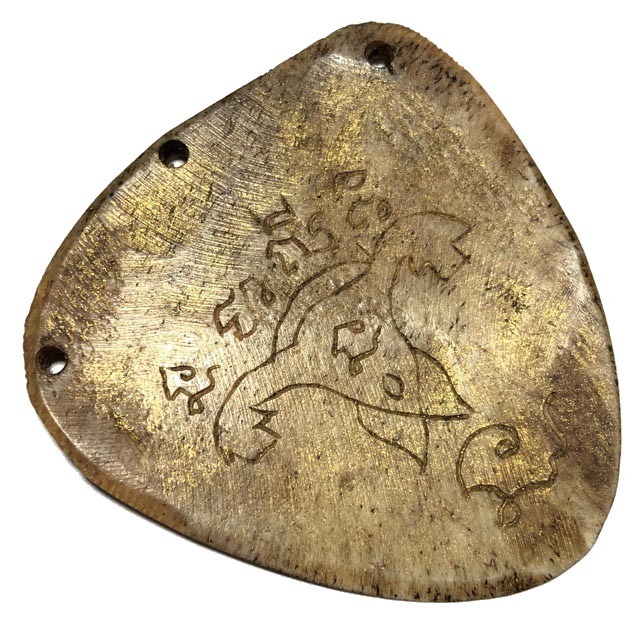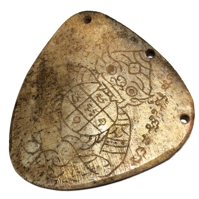 Hand Carved Ban Neng Bone Varving with Maha Amnaj from the elephant forehead bone, with the Wicha Pra Rahu Om Jantr. An Extremely Rare and Sorcerous Necromantic Animist Charm with hand inscription of Pra Rahu Asura Deva, and Khom Agkhara Spells, with Invocations of the Pra Rahu Asura Deva Eclipse Deity inscribed on the rear face, An extremely rare Individually carved Ancient Amulet from Luang Por Pina of Wat Sanom Lao.