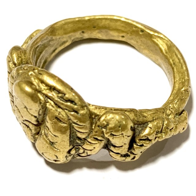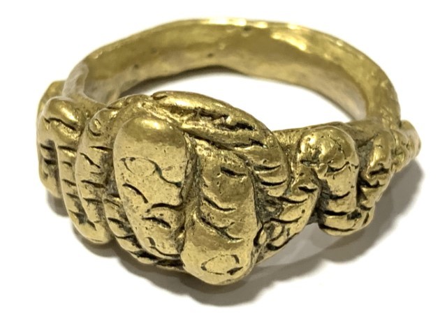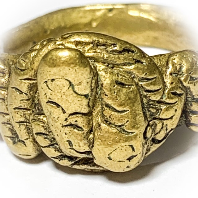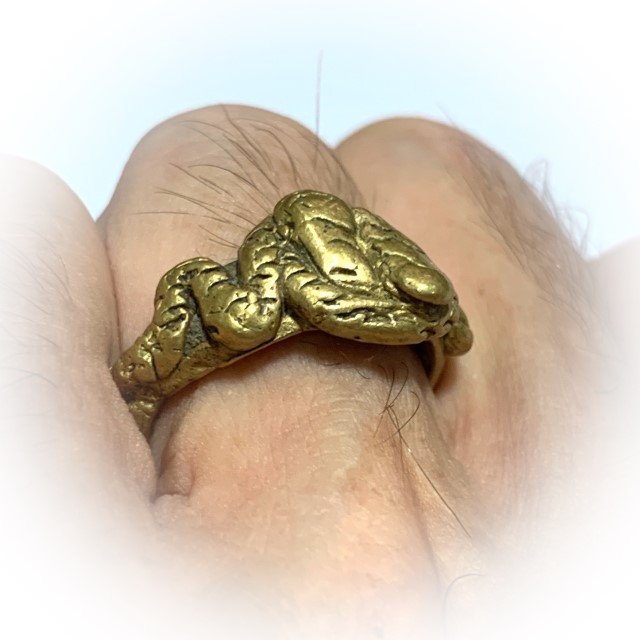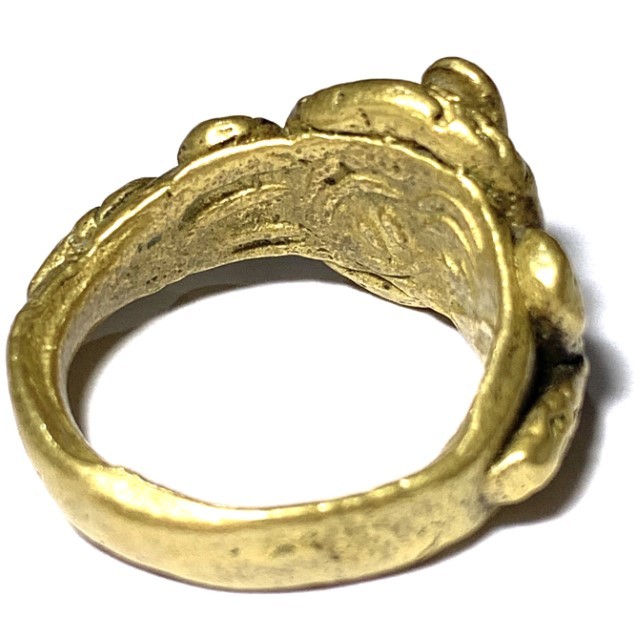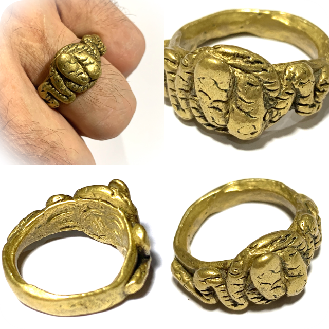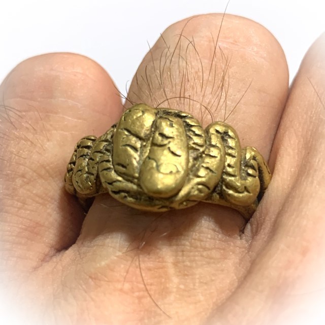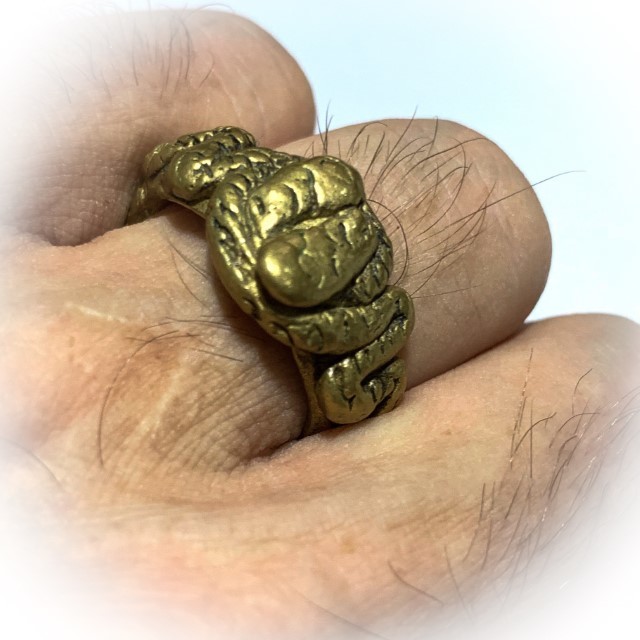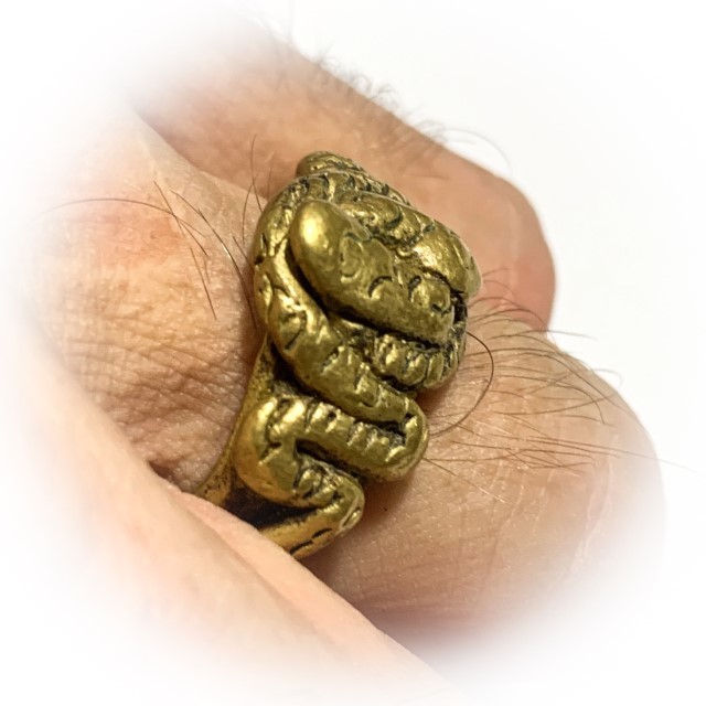 A very rare and highly preferred magic alchemical metal ring using the Wicha Ngu Giaw Sap (snakes entwined around treasures), from Olden Days Miracle Monk, Luang Por Im, of Wat Hua Khao. The Hwaen Giaw Sap is forged from a highly sacred and powerful admixure of alchemical metals and ancient artifacts.