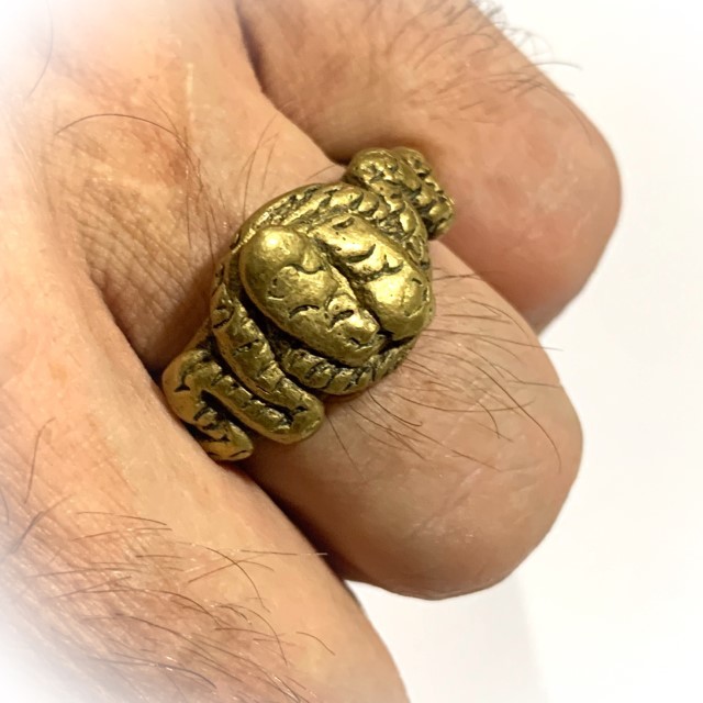 The ring itself is formed into the shape of two snakes entwined, in ancient primitive style of bygone eras, and exudes an aura of power through the alchemical metal substance. Famous for Maha Pokasap and its power to protect.