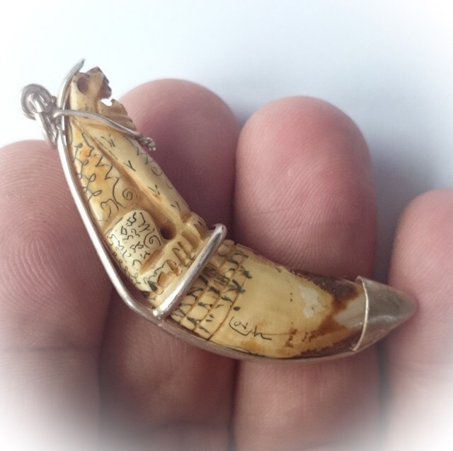 Khiaw Suea Fai Asian Golden Jungle Cat Tooth, hand carved and inscribed with Khom Agkhara from Luang Por Nok, of Wat Sangkasi - Circa 2450 BE - Kong Grapan Chadtri Maha Amnaj Talismanic Amulet of Master Class Status. The tooth is encased with a solid silver wire frame and pendant hoop for wearing.