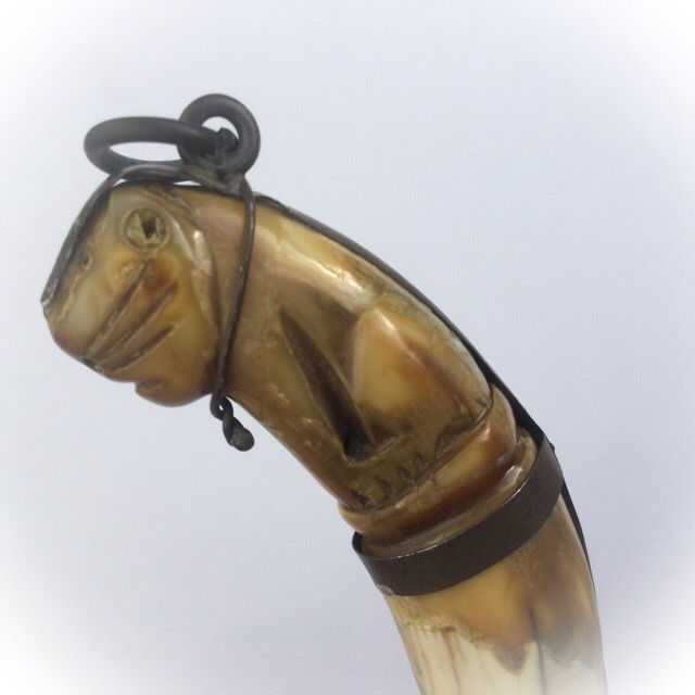 The tiger tooth has a pendant hoop ring, for attaching to a cord around your waist, or for other methods of attaching as a pendant.