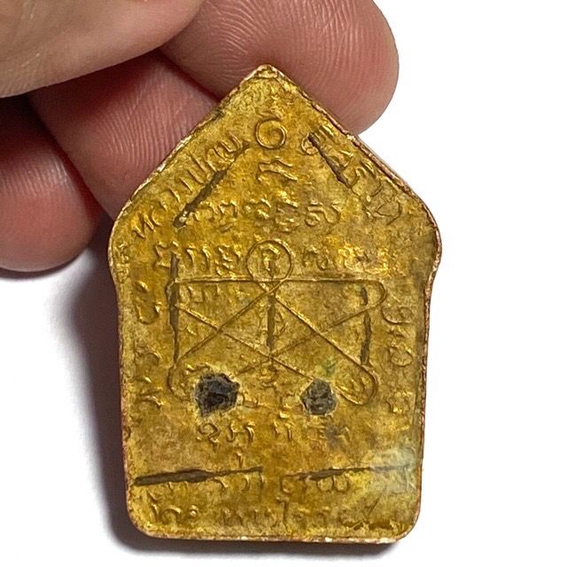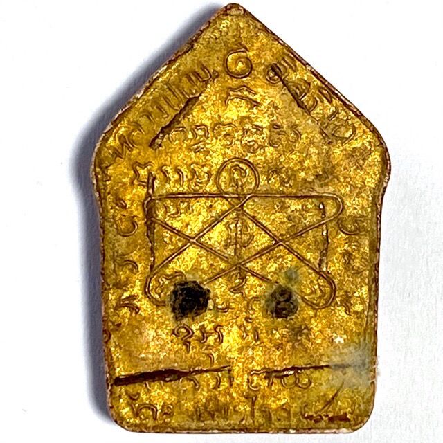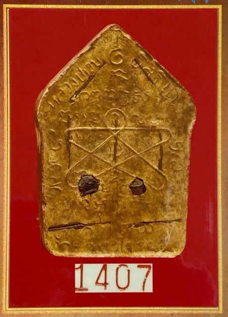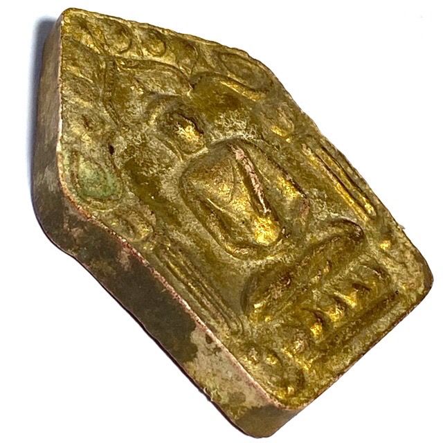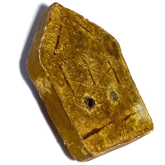 The Block Tong Hlueang mold was created after the previous block press mold broke, the 'Block Hin Meed Gone', which was carved from the sharpening stones used by monks to sharpen their razor blades to shave their heads. Block Tong Hlueang is preferred over the Block Hin Meed Gone, and carries a slightly higher price-tag and eminent status to the Block Hin Meed Gone with the Wongarn Pra Niyom Collector Circles. The rear face has double Takrut Sariga inserted into the Yant Grabork Khwai Yantra.
