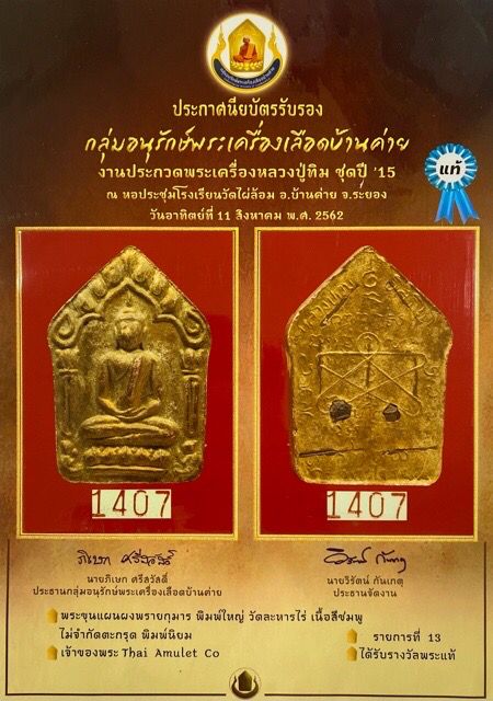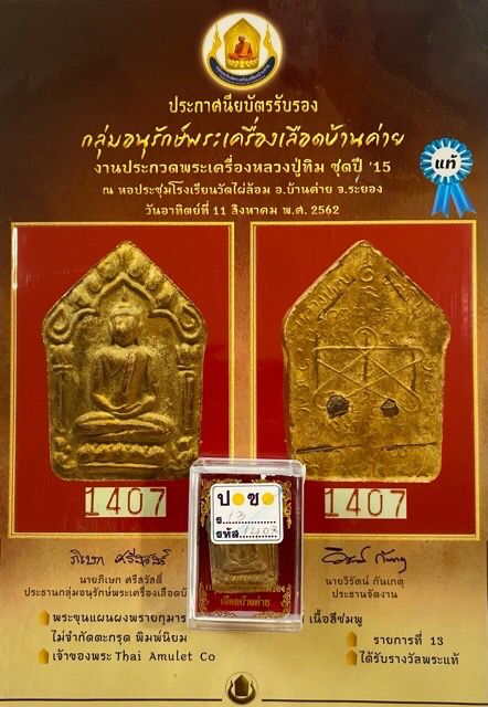 Presenting a Second Prize Competition Winner Certificated, an exquisitely beautiful Pra Khun Phaen Prai Kumarn 2515 BE Pim Yai Niyom Block Tong Hlueang (Block 2) Hlang Dtok Dtaeng Niyom Nuea Chompoo Khaw Hniaw Suk Pasom Pong Prai Kumarn Ta Bronze Wanich Dtem Ongk with 7 Takrut Sariga Koo - Luang Phu Tim Issarigo - Wat Laharn Rai. This item comes with free express international Shipping included. This Khun Phaen Pi 15 Pim Niyom amulet, is a very well preserved exhibit of a highly sought after Pra Niyom Master Class Amulet, in pinkish powders blessed sticky rice sacred clay fully covered with Bronze Wanich. The rear face shows the insertion of seven Takrut Sariga inserts, and two Chin Aathan Necromantic Inserts. The amulet has the classic fluffy appearance of authentic bronze Wanich gold coating, and the rising up of Pong Prai Kumarn powders.