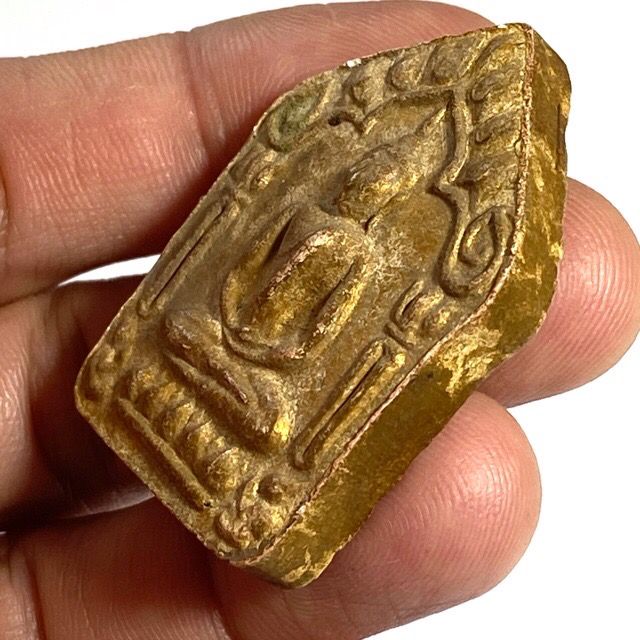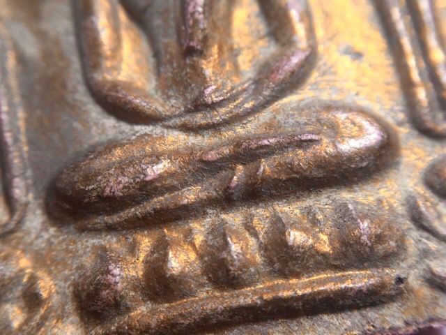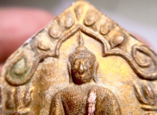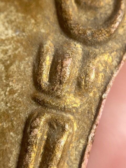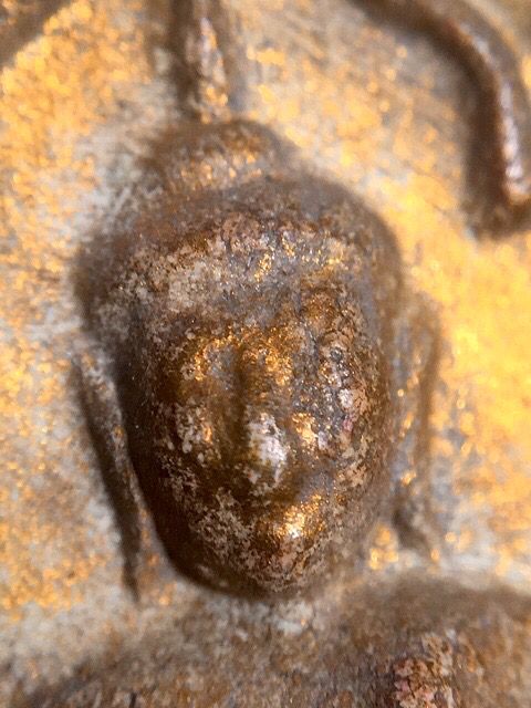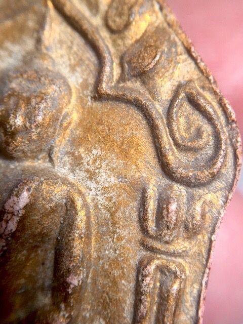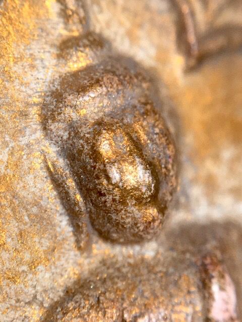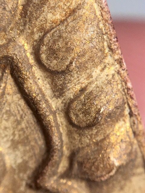 Visually, this type of sacred clay has a very marbled appearance from the presence of Khaw Hniaw Sukh, and many say that the presence of pieces of Pra Somdej Wat Rakang Kositaram were used in many models, which is what brings the marble like stone appearance of 'Dtaek Lai Nga (crackled surface effect). Further close observation under the eye loupe reveals true depth and dimension, and is full of the classic characteristics of Pong Prai Kumarn powders present within the Muan sarn clay. And when such an amulet is gold coated, has a highly fluffy textured surface.
