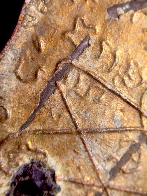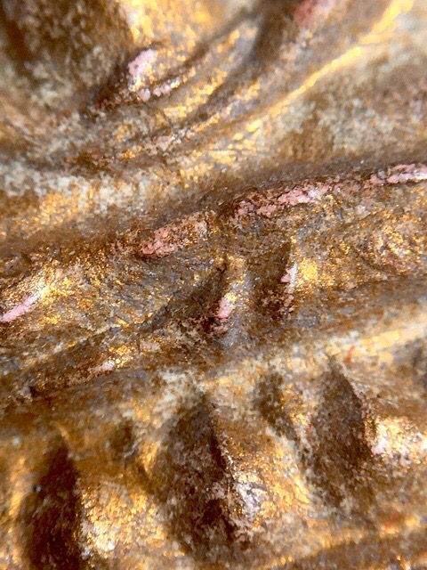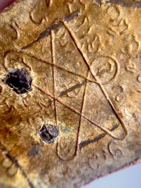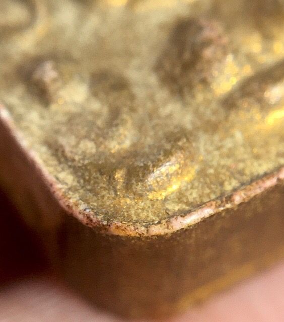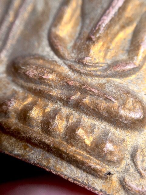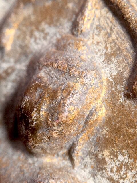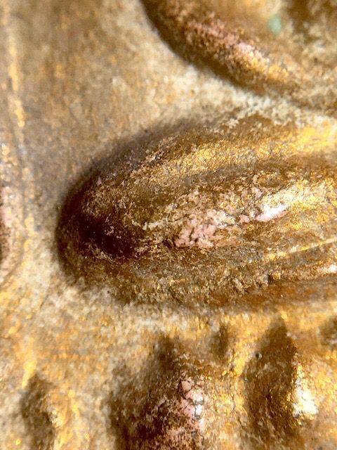One can see a very fluffy and rich texture to the Sai Rae golden coating on the surface of the amulet, in reaction with the Muan Sarn Sacred Powders. It is a part of the amulet appreciation society expert's method of authentication to examine and study the appearance of how the Sai Rae Tong develops in surface texture, tonality and porosity of the surface, as well as the appearance of Luang Phu Tim's famous Pong Prai Kumarn which rises up and through the surface.