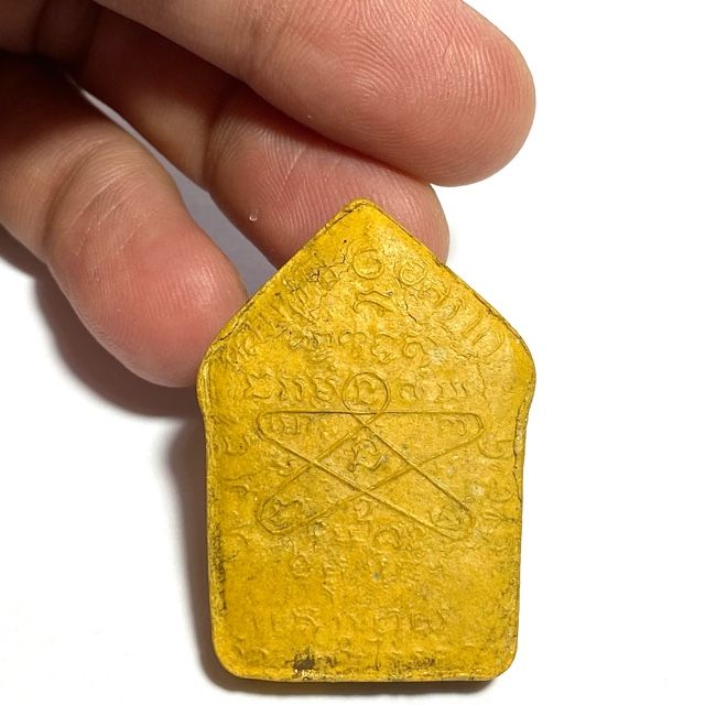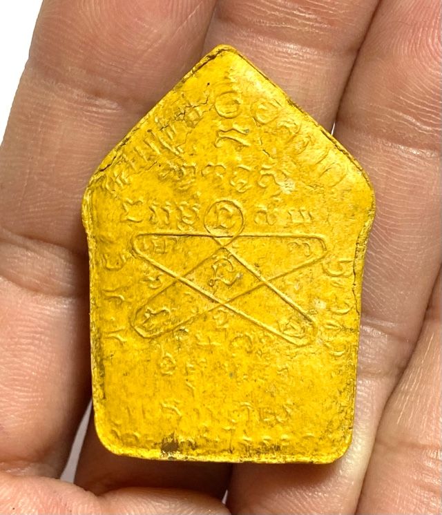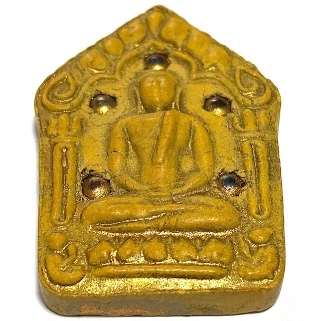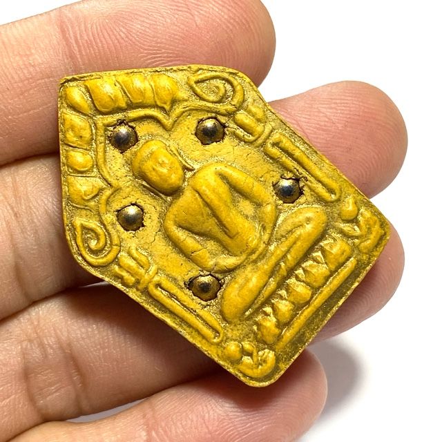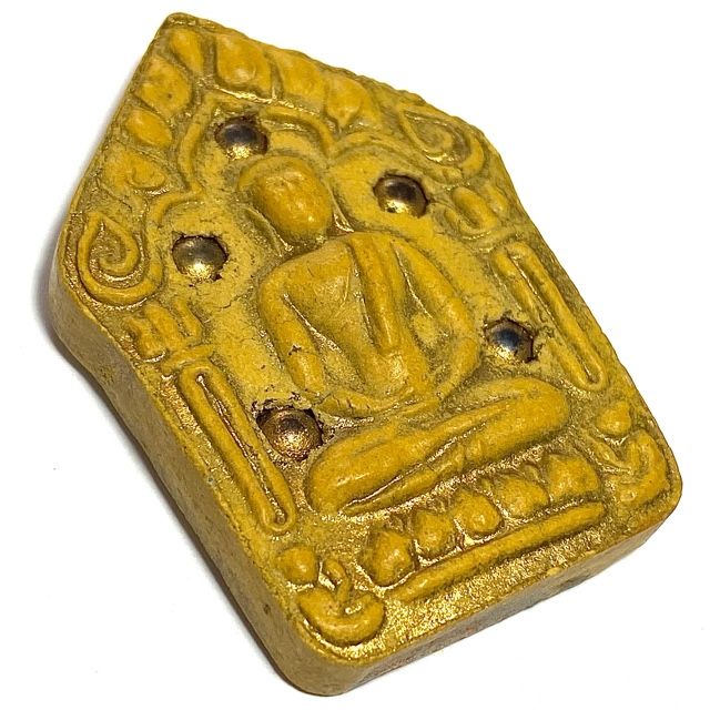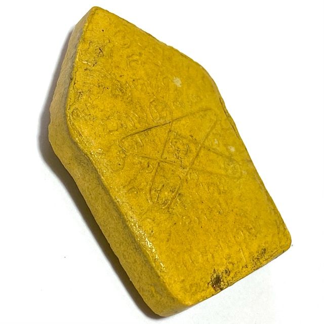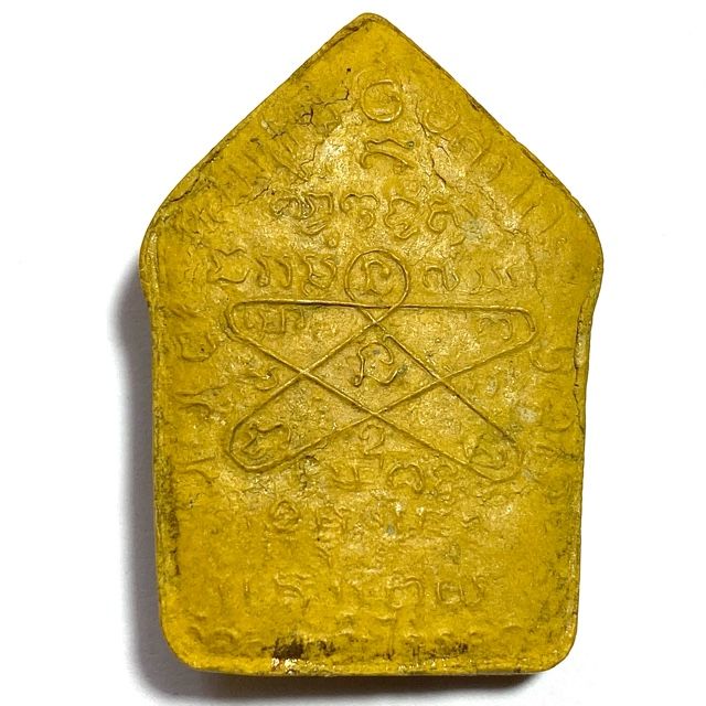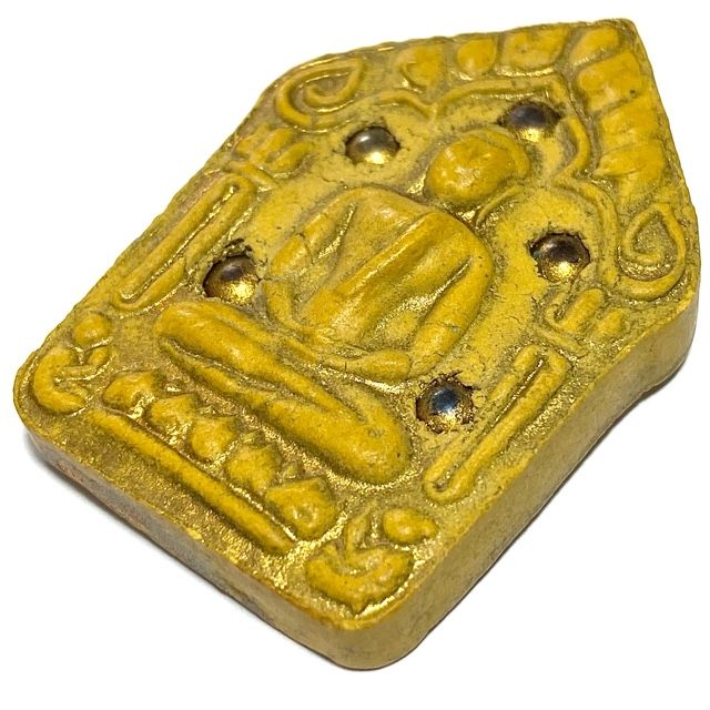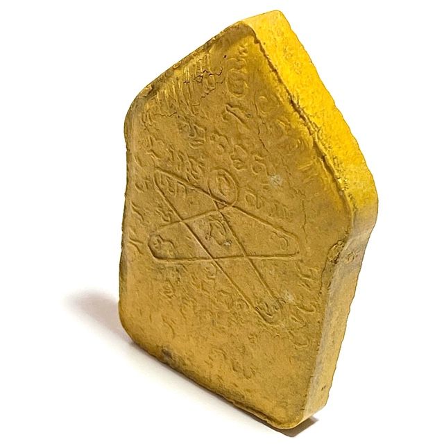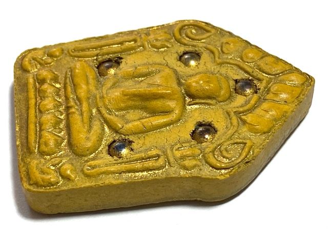 The Block Tong Hlueang mold was created after the previous block press mold broke, the 'Block Hin Meed Gone', which was carved from the sharpening stones used by monks to sharpen their razor blades to shave their heads. Block Tong Hlueang is preferred over the Block Hin Meed Gone, and carries a slightly higher price-tag and eminent status to the Block Hin Meed Gone with the Wongarn Pra Niyom Collector Circles. The rear face has single Takrut Maha Bpraab inserted into the Yant Grabork Khwai Yantra.
