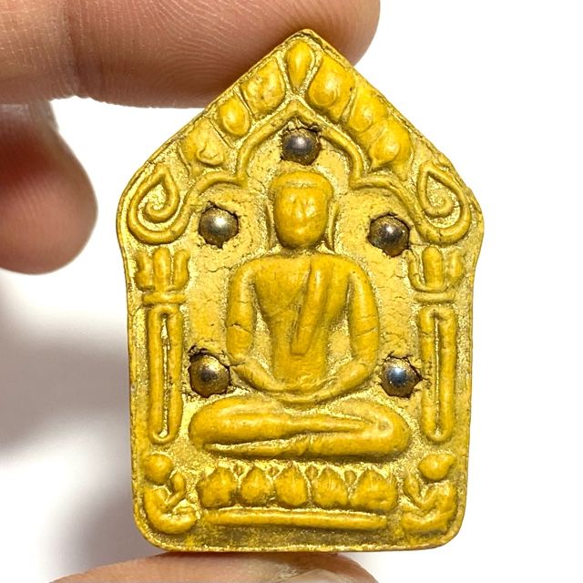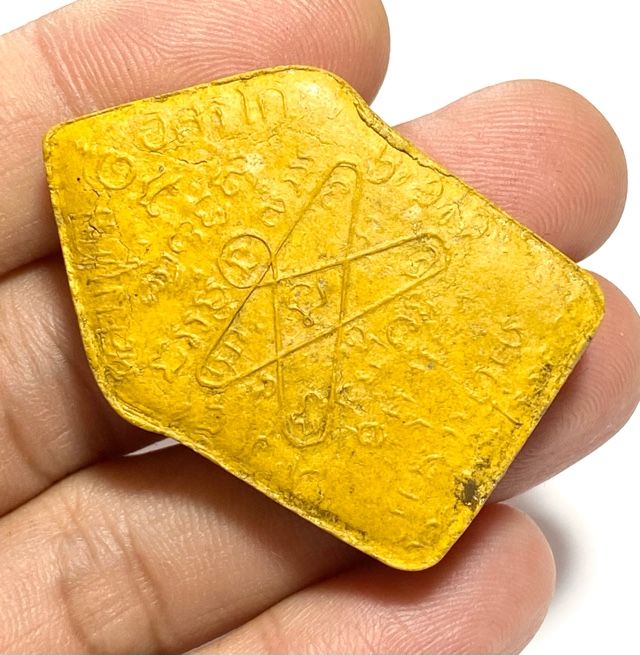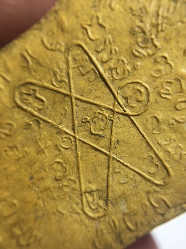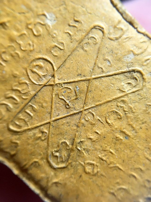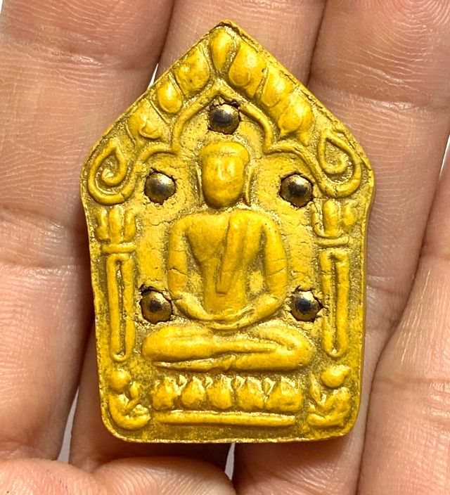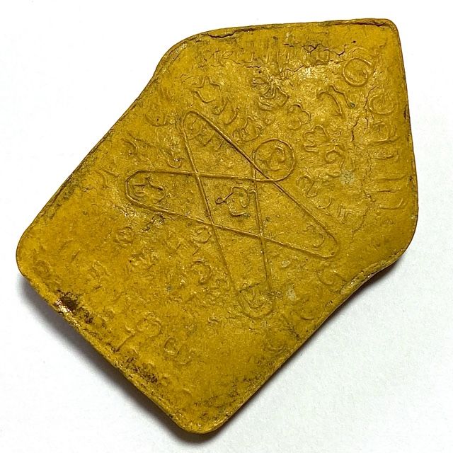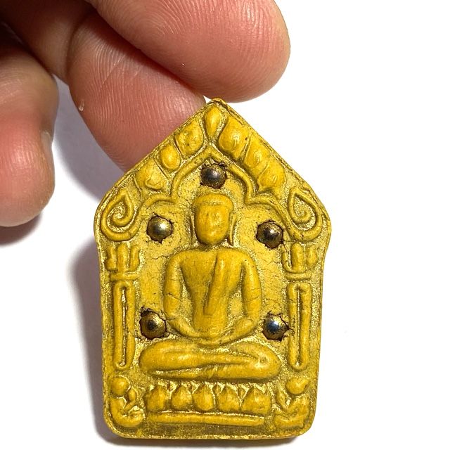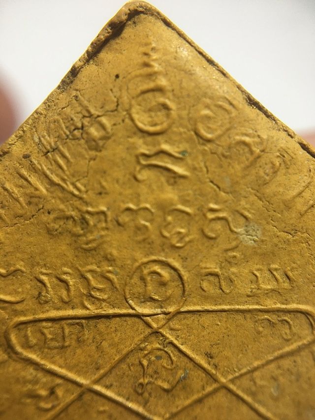 The Block Tong Hlueang mold was created after the previous block press mold broke, the 'Block Hin Meed Gone', which was carved from the sharpening stones used by monks to sharpen their razor blades to shave their heads. Block Tong Hlueang is preferred over the Block Hin Meed Gone, and carries a slightly higher price-tag and eminent status to the Block Hin Meed Gone with the Wongarn Pra Niyom Collector Circles. The rear face has single Takrut Maha Bpraab inserted into the Yant Grabork Khwai Yantra.