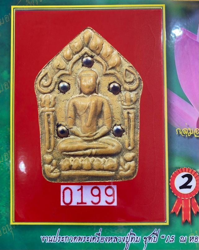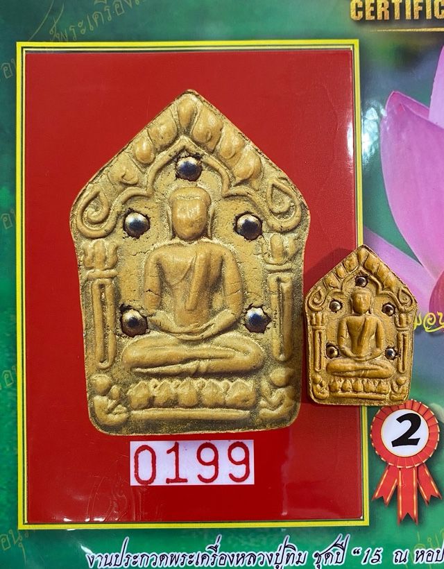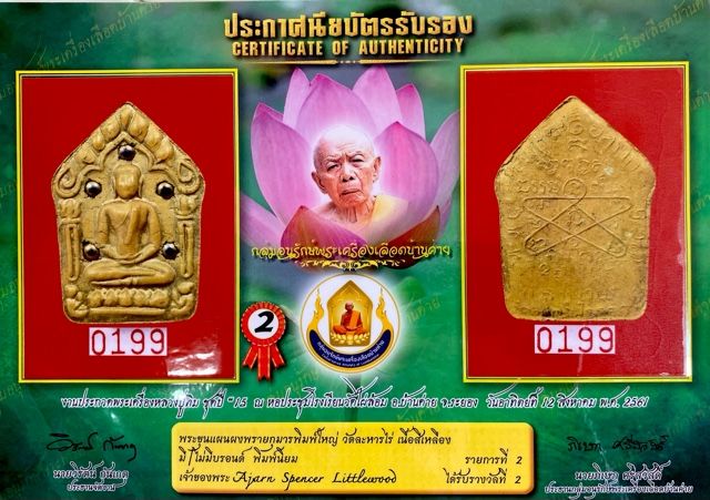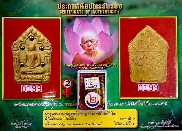 Below; A4 size second prize winning ribboned Authenticity Certificate from the 12th August 2561 BE Luang Phu Tim Association of Luead Ban Kaay Meeting, under the category of Pra Khun Phaen Prai Kumarn Pim Yai Niyom, without bronze or gold coating (2nd prize for all ungilded models)