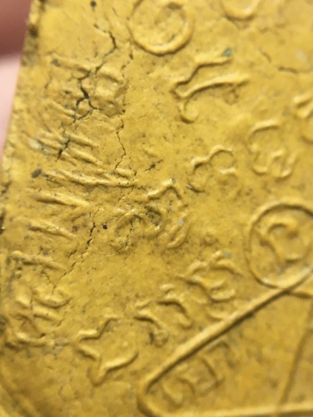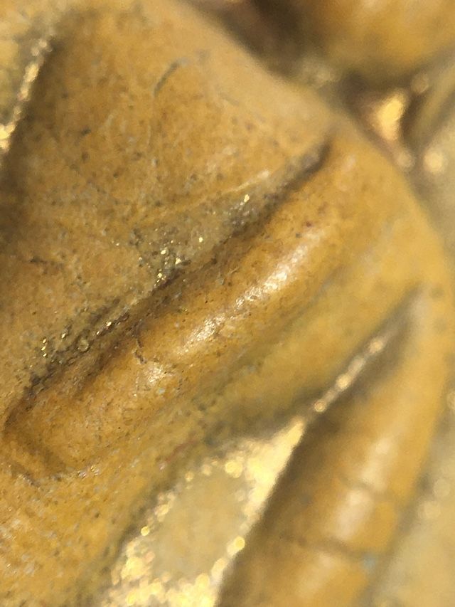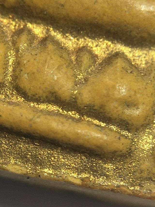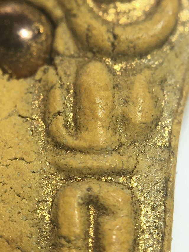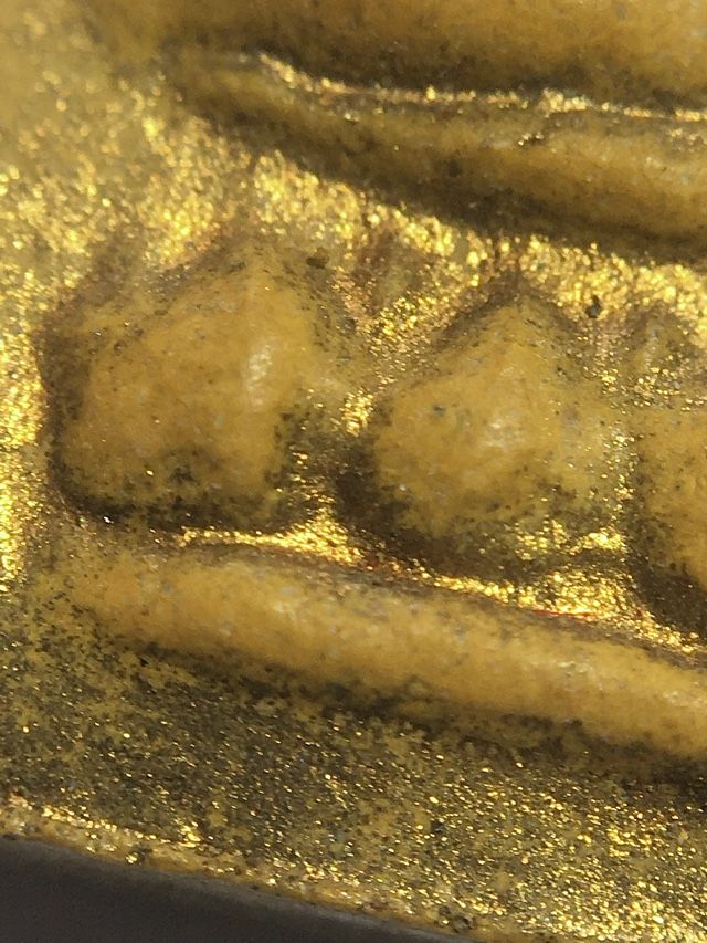 One can see a very fluffy and rich texture to the Sai Rae golden coating on the surface of the amulet, in reaction with the Muan Sarn Sacred Powders. It is a part of the amulet appreciation society expert's method of authentication to examine and study the appearance of how the Sai Rae Tong develops in surface texture, tonality and porosity of the surface, as well as the appearance of Luang Phu Tim's famous Pong Prai Kumarn which rises up and through the surface.