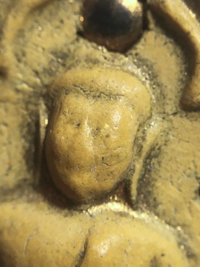 Visually, this type of sacred clay has a very soft and subtle appearance, but which further observation under the eye loupe reveals true depth and dimension, and is full of the classic characteristics of Pong Prai Kumarn powders present within the Muan Sarn clay.