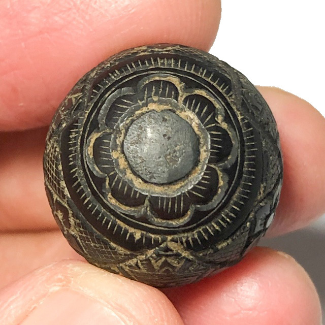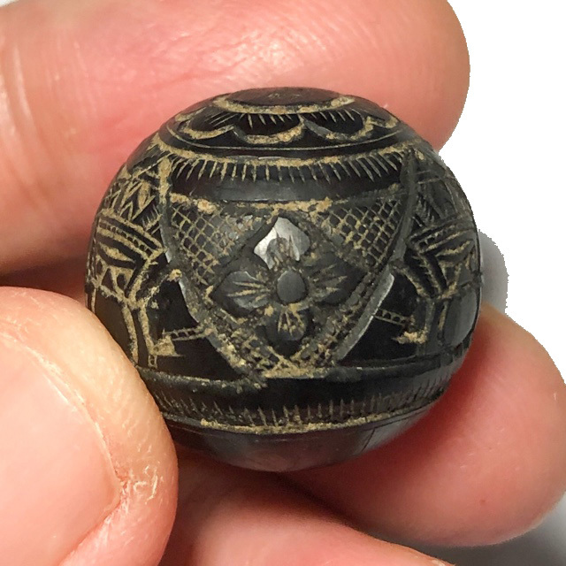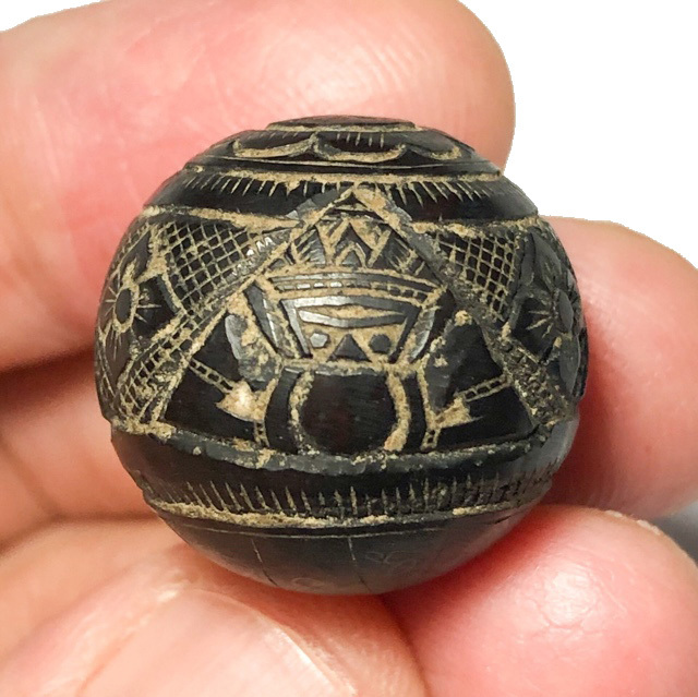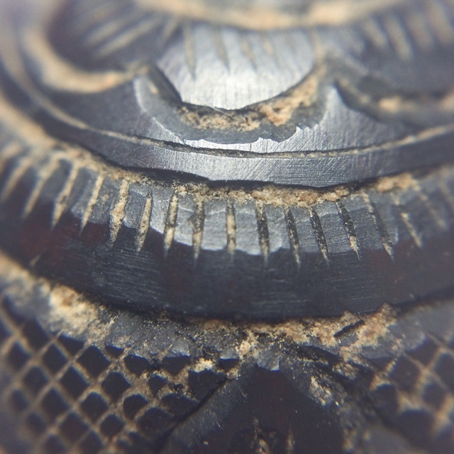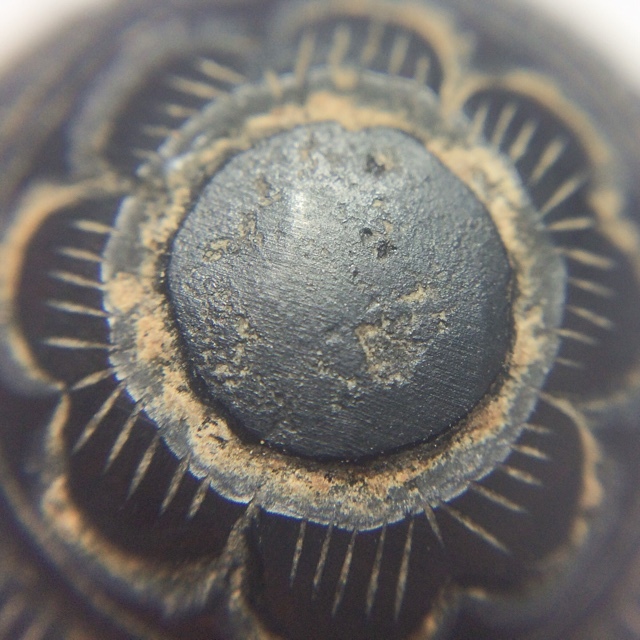 One of a small number of very old hand carved miniature Ceremonial Look Kala Mai Mee Ta eyeless coconut miniature anomalies we obtainied, and one of the extreme rarities of the amulet pantheon from a highly preferred top master of Wicha Pra Rahu, Luang Por Noi, of Wat Srisa Tong, in Nakorn Pathom. There are many levels of detail found in the carved Kala Mai Mee Ta of Luang Por Noi, ranging from that of the simple village artisan, to the fine master craftsman. Because masters and apprentices spend the final years before the passing of the Master making amulets in collaboration, the Kot Kala Mai Mee Ta is often misrepresented or inaccurately stated as being from LP Pin, which in fact, may be true in the sense that LP Pin always assisted LP Noi in his amulet making during the final decades.