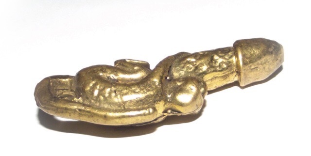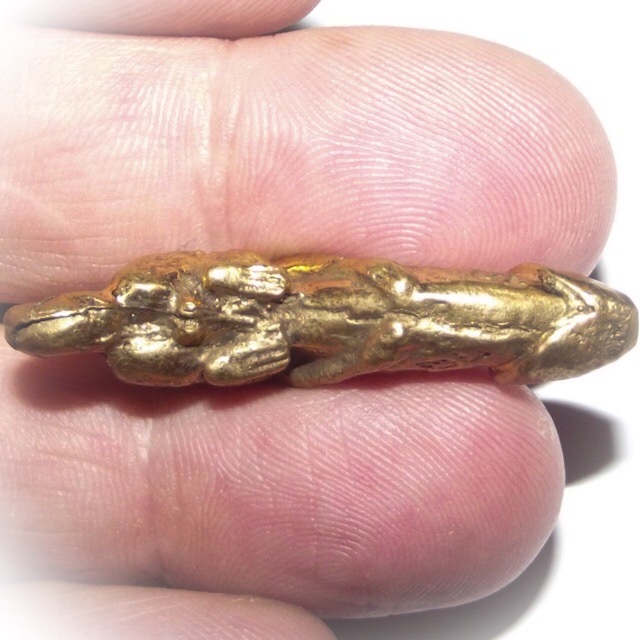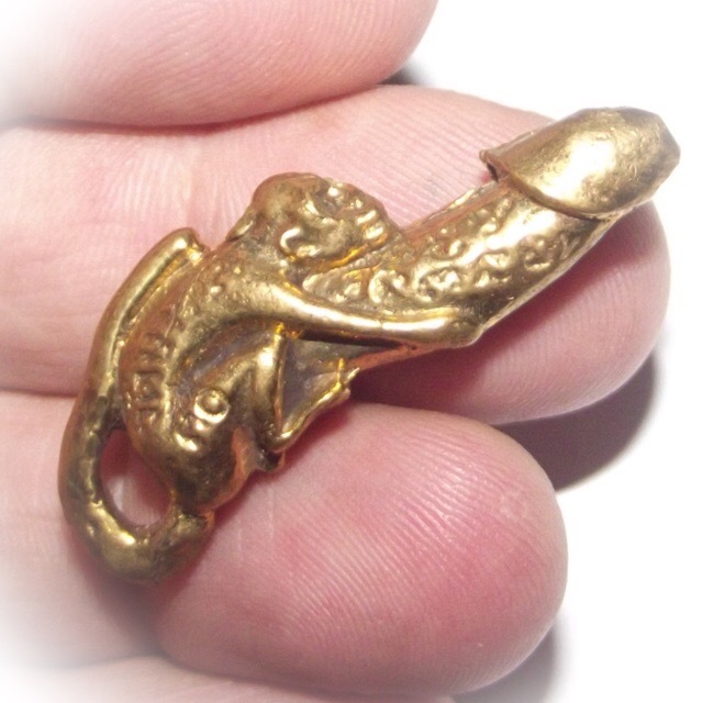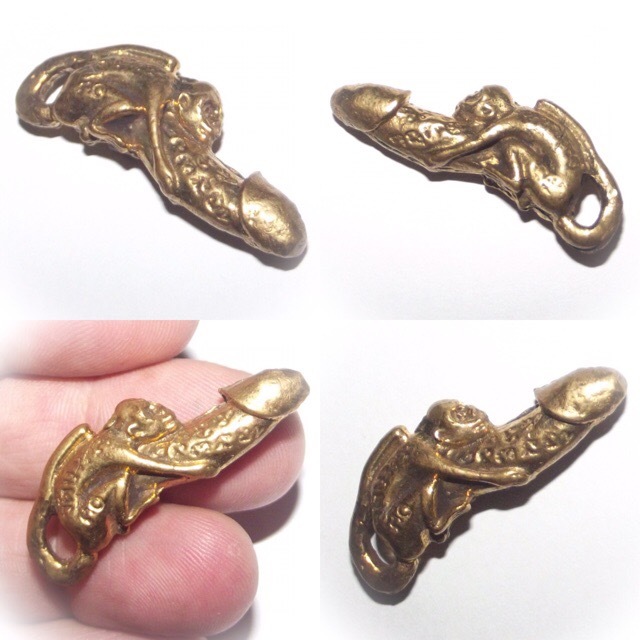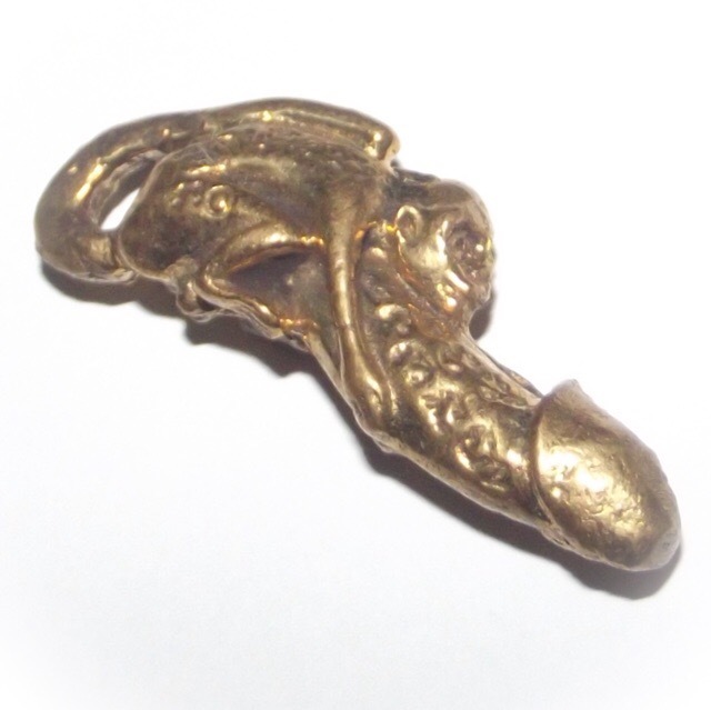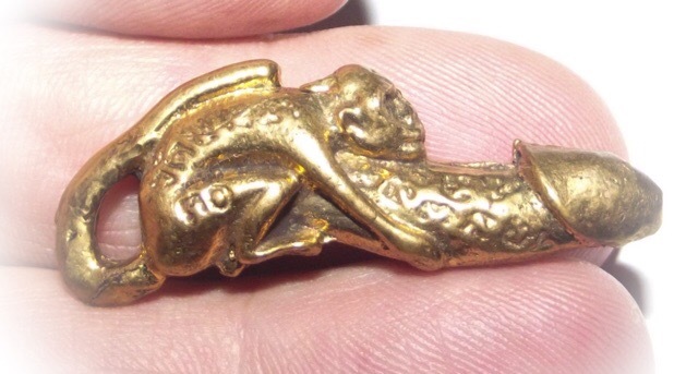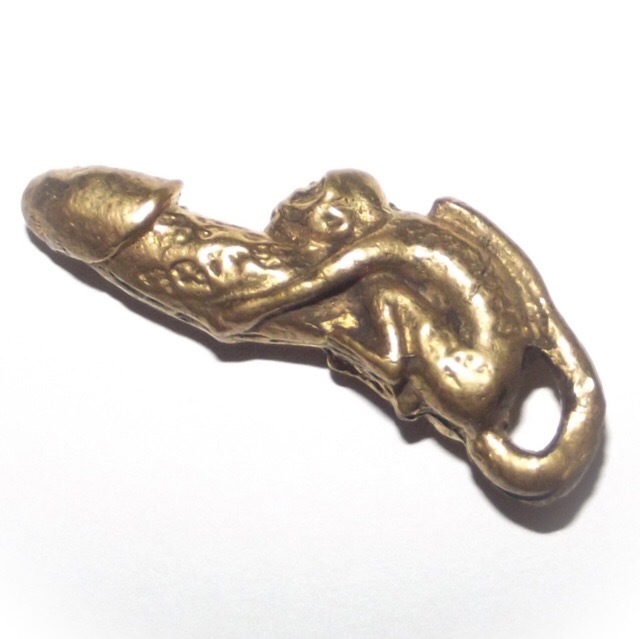 Palad Khik Ling Jab Hlak Nuea Tong Luang - Luang Por Seng Wat Bang Na (2444 - 2531 BE) - The amulet features a Vanora (Simian Monkey) clinging to a Palad Khik Lingam (phallic). The tail of the Monkey forms a hoop for threading a waist cord through and wearing around the waist, or on a pendant chain. Maha Sanaeh, Maha Lap, Maha Sanaeh, Klaew Klaad Metta Mahaniyom.