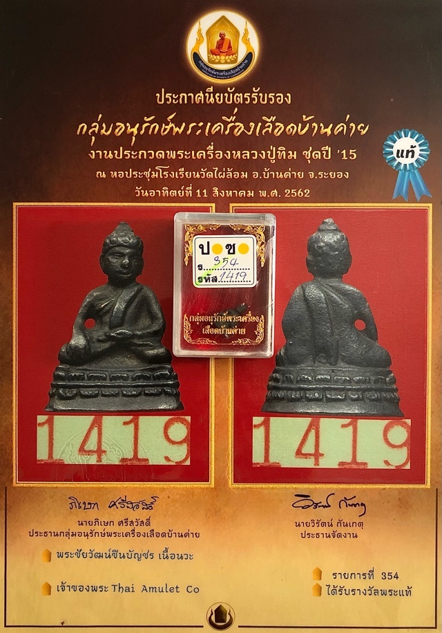 This exhibit is a pristinely well kept amulet, and an all time Pra Niyom Master Class Amulet of the High End Category, authenticised by the Luead Ban Kaay Luang Phu Tim association of Dr. Phisek which comes with Plastixized A4 size Certificate, and free EMS shipping Worldwide included. An excellent amulet for Meditation, Healing, Promotion, Good Karma, and Pure Buddhanuissati and Gurunussati rremembrance of the Buddha, and the Guru.
