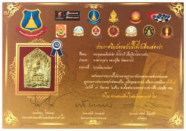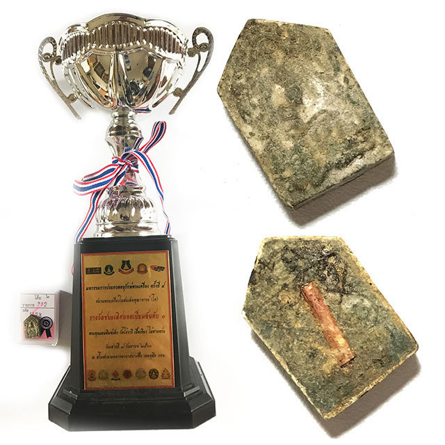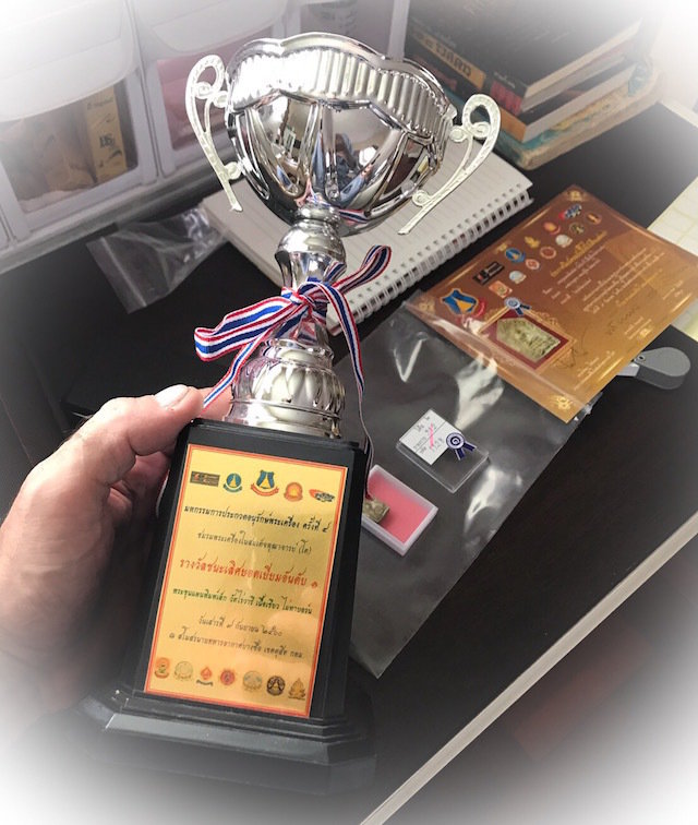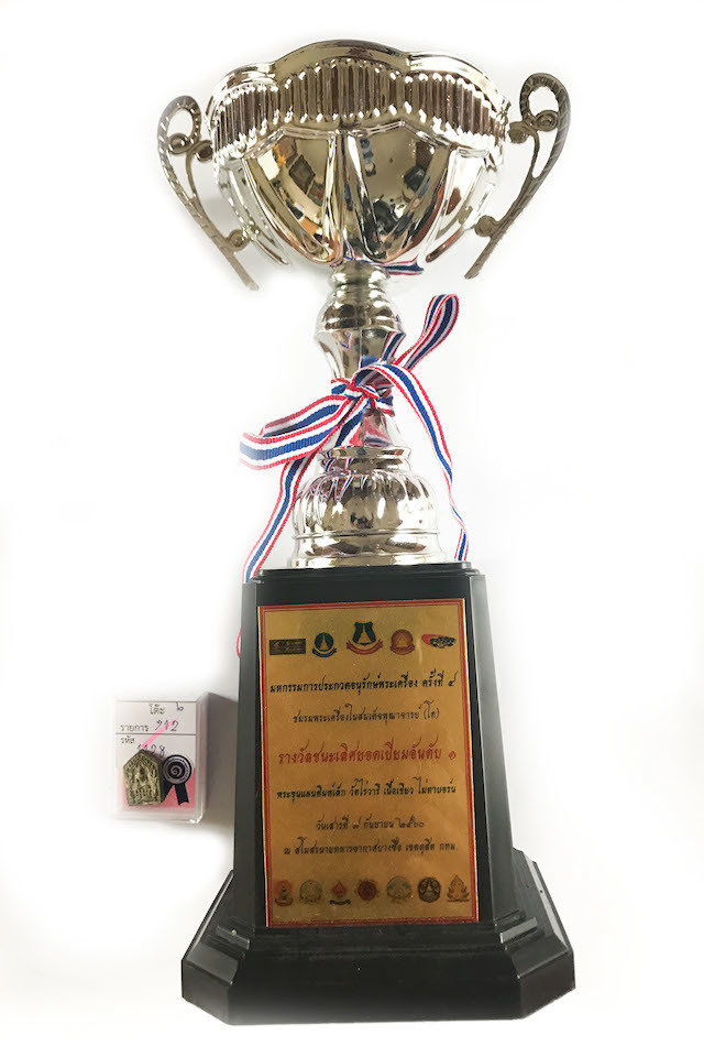 Below; this amulet (Official registry number #1128) comes with certificate of authenticity from the Amulet competition of the Somdej Pra Puttajarn (Dto) Prohmrangsri amulet appreciation association, which we will send with the amulet for you to keep and frame, along with the 1st Prize Trophy.