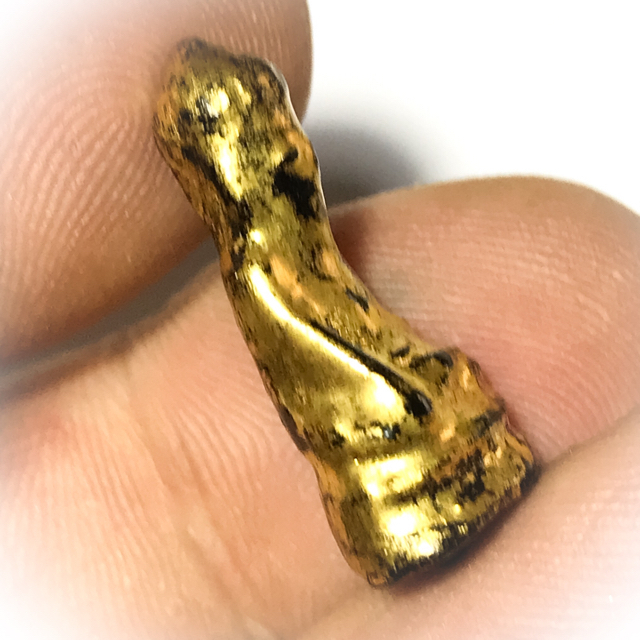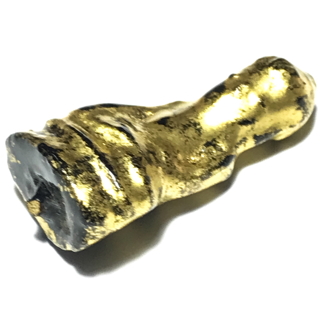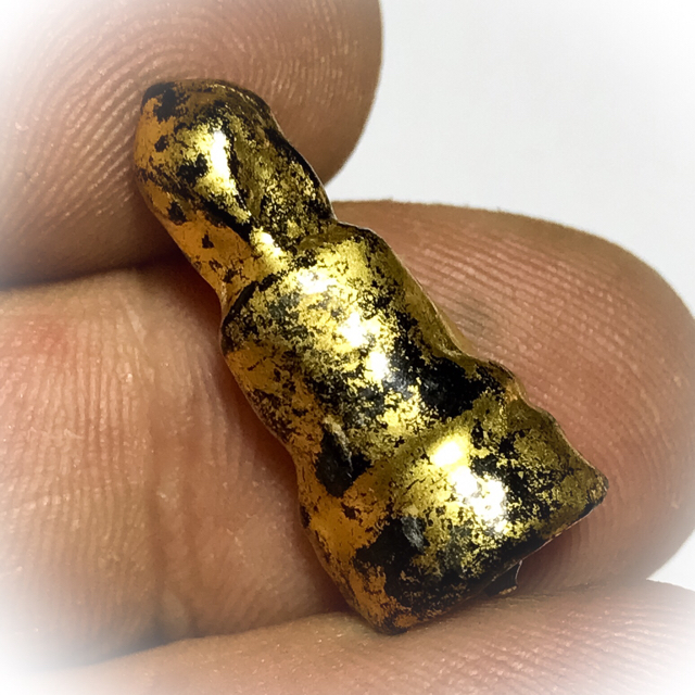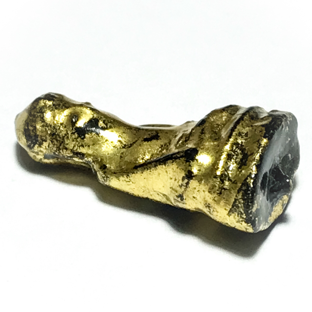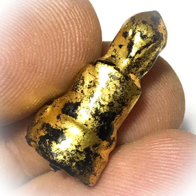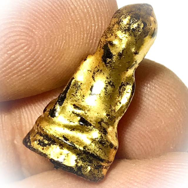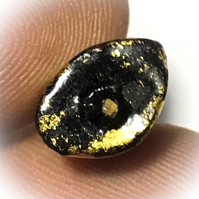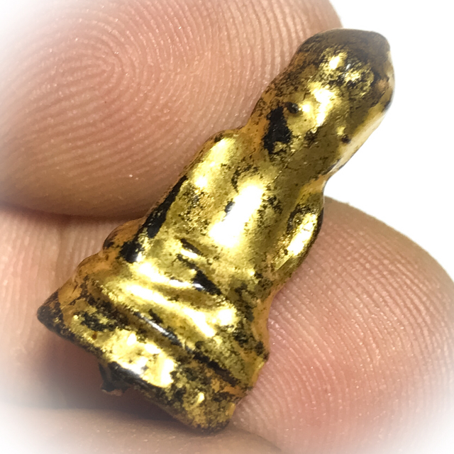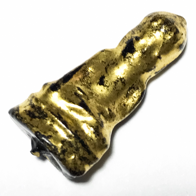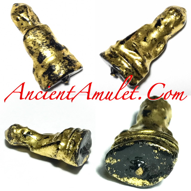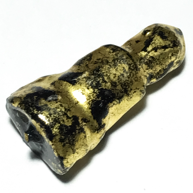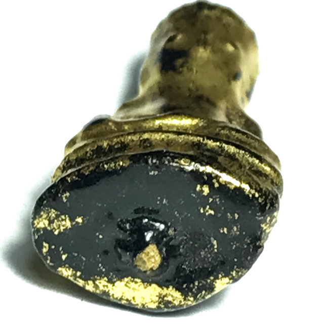 Pra Upakut (Bua Khem) Arahant (Western Name; 'Upagupta') - Nuea Pong Long Rak Pid Tong - Sacred Powders with black herbal Laquer and Gold coating, and Sacred wood inserted in the base, from the Kru Wat Chana Songkram Archeological Find of 2495 BE at the temple of Wat Chana Songkram in Banglamphu. The Upakut were made in Pim Lek (smaller) and Pim Yai (larger) models. This is the Pim Yai larger version measuring 2.5 Cm high. Men favour both models, but this smaller model is the most highly favoured by ladies, for its petiteness. Both large and small models are equally valued and equally rare.