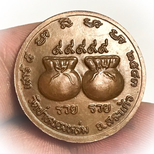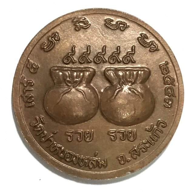The rear face of the coin has two 'Thung Sap' Treasure Sacks, with 5 x the Thai Numeral 9 (๙๙๙๙๙) above them, and the words 'Ruay Ruay.