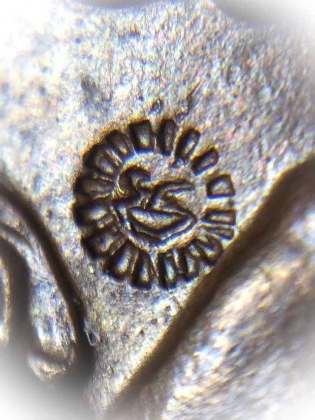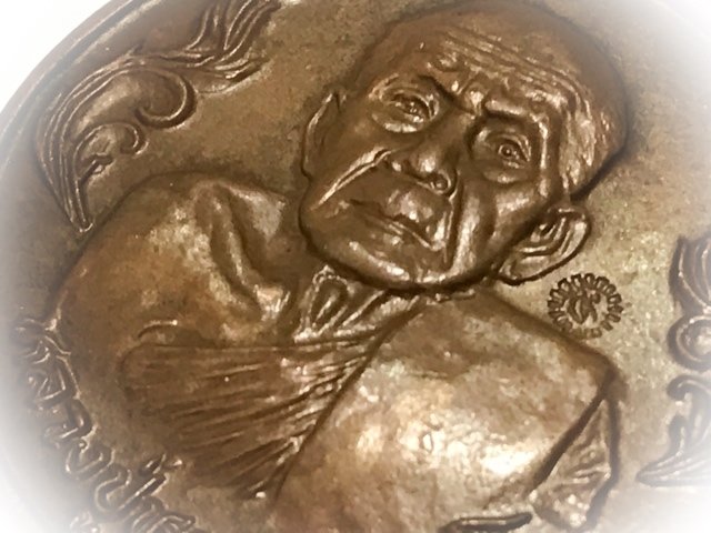 The front face of the amulet features the image of Luang Phu Hmun with his name 'Luang Phu Hmun Tidtasilo' embossed below his semi-torso cameo image. Either side are granok Flame decorative embellishments.To the side of Luang Phu's left shoulder (our right), there is the code Ma Khom Agkhara stamp embossed on the surface.