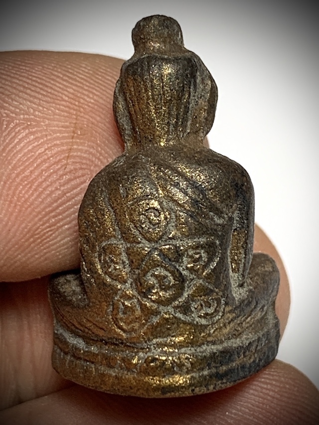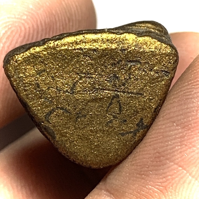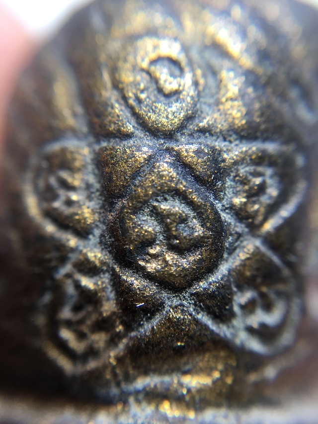 This exhibit is absolutely packed full of Pong Prai Kumarn, with Sai Rae Tong Kam gold flakes visible embedded within the Muan Sarn Sacred Powder clay. Luang Phu Tim's Sacred Yant Ha (Yant Grabong Khwai 5 Dhyani Buddha Yantra), on the rear face provides Metta and Kong Grapan Chadtri, Klaew Klaad, and Serm Duang power to the wearer, and empowers the Ruesi with the Wicha Putttasart (Buddha Magic/White Magic).