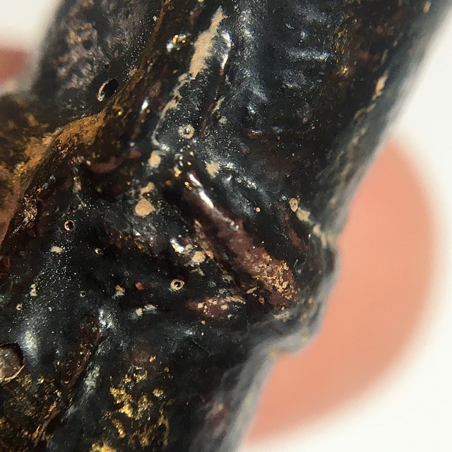 He would first immerse the forehead skin in holy water to soften the dry skin, and then scrape off the fur, to leave bare skin, and then use the skin to wrap into Takrut scrolls, which he would inscribe and empower with Wicha Maha Ud. He would also then once the skin was soft through immersion, inscribe further Khom Agkhara Sanskrit spells, to invoke the spirit of the tiger, using the Wicha Akarn 32, and the Wicha Hnun Taat 4, to reanimate the power and spirit within the tiger forehead. Luang Phu would then tie the wrapped Hnaa Bpaag Suea hide scroll with holy Sinjana cords, to prevent the scrolls from unwinding as they dried over the decades. The Takrut are seen to be lacquered, many with flakes of gold leaf visible. Most will have the Sinjana cord wrapping, but there are also some exhibits which do not have the Sinjana cord binding too (rarer).