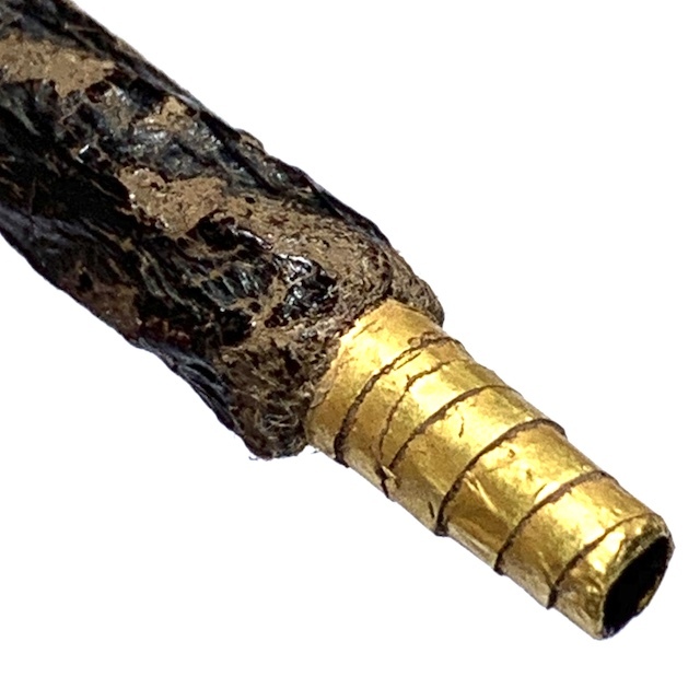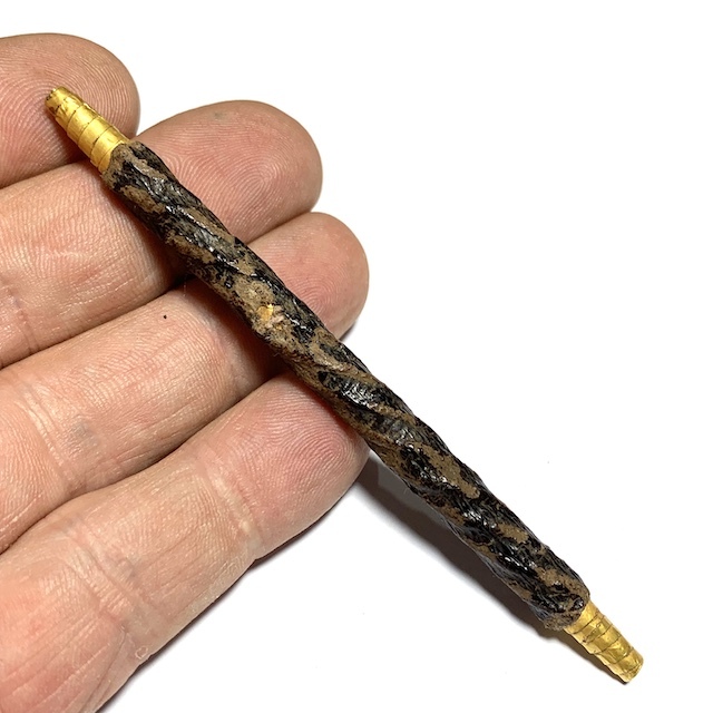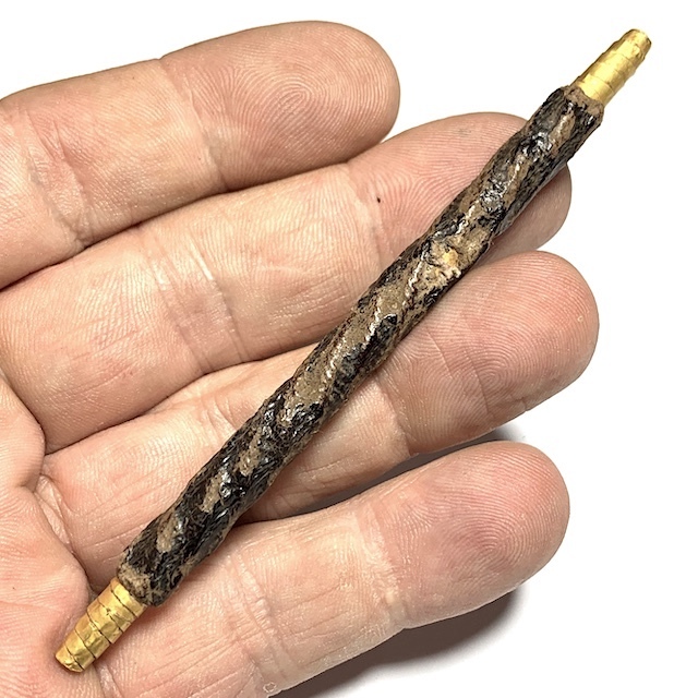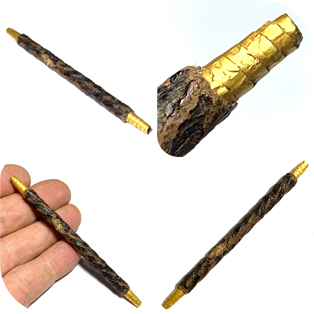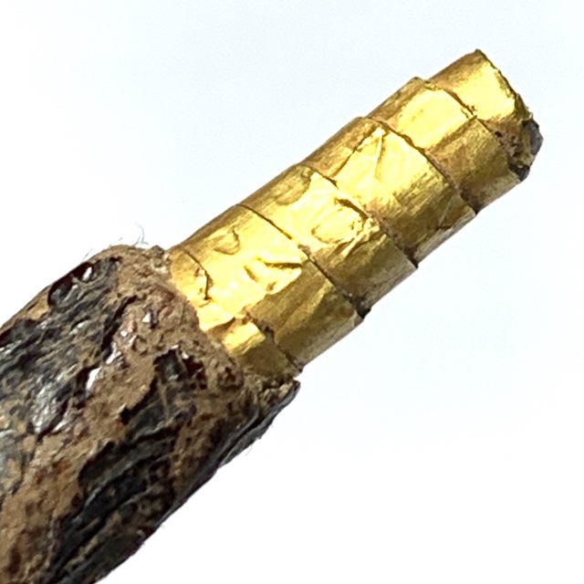 An Immensely rare Solid Gold takrut Foil version of the already extreme rarity, the Takrut Maha Solos Mongkol Nuea Tong Kam of Luang Phu Iam. Even rarer than the already extremely rare silver versions, which, along with the gold versions, were only made when wealthy devotees and Important persons brought the Gold or Silver foils for Luang Phu to Make Takrut for them when they came to make Merit.This Takrut has been taken to Goldsmiths for testing and has been confirmed to be pure solid gold Yantra foil, and well worth its weight in gold alone, without even considering the sacred aspects and the antique nature of this exhibit