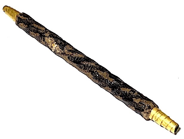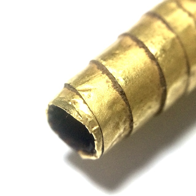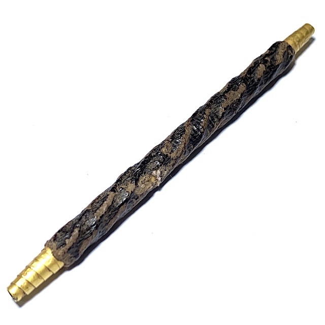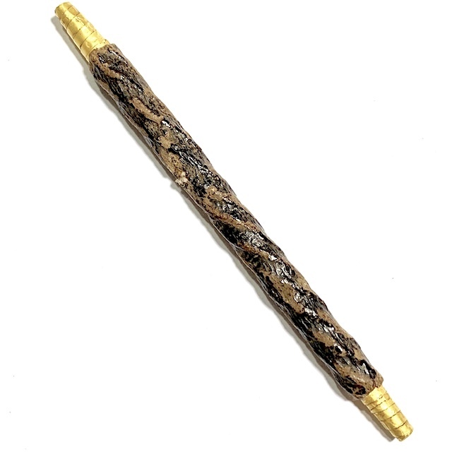 Notable for its protruding foil at each end of the cord bound lacquered Takrut. The rich color of the blackened agėd ancient Rak Chart Jeen Chinese Lacquer reveals the Takrut to be from the early-mid Era of Luang Phu Iam's trajectory as as Master of Wicha. The Takrut Maha Solos Mongkol amulets, were usually made in Nuea Tong Daeng (Sacred Copper), Takua (Alchemical Lead), or Tong Hlueang (Almsbowl Lid Brass).